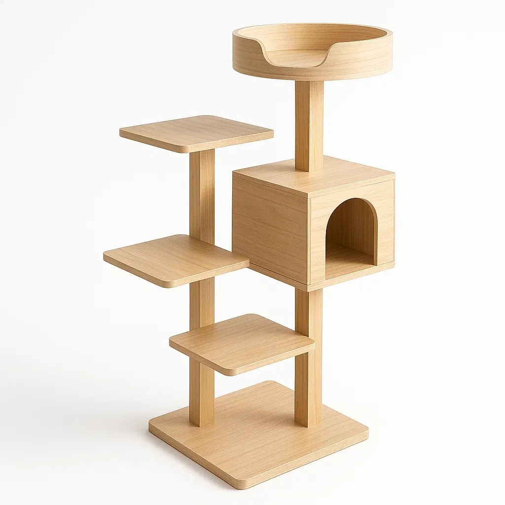 Vielseitiger Kratzbaum mit mehreren Ebenen und einem geschützten Häuschen für Ihre Katze zum Spielen, Klettern und Ausruhen.